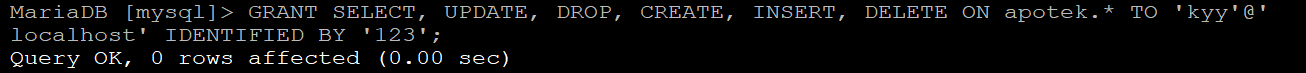 Note: Pada Grant Dibawah bagian "apotek.*" Disitu Diartikan Kalian Di izinkan Memakai Query Tersebut Kepada Semua Table Yang Dibuat. Bisa Dibilang Unlimited.