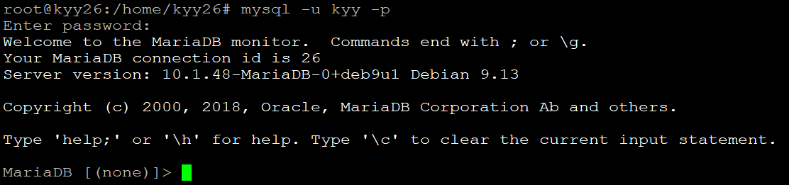 Kita Login Terlebih Dahulu Kedalam User Yang Sudah Dibuat Tadi Dengan Command "mysql -u kyy -p"