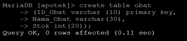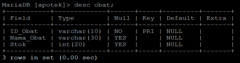 Oke Langkah Selanjutnya Kita Lihat Hasilnya Dengan Ketik Command "desc obat"
