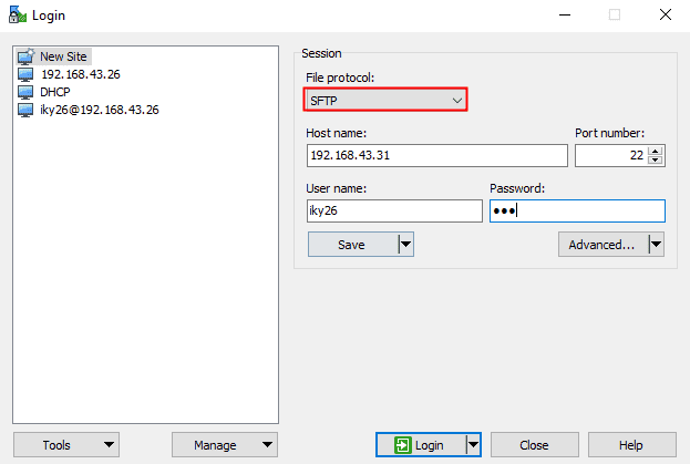 - Jika Sudah Di Konfigurasi Kita Pengujian Dengan WinSCP, Lalu Kita Login Terlebih Dahulu.