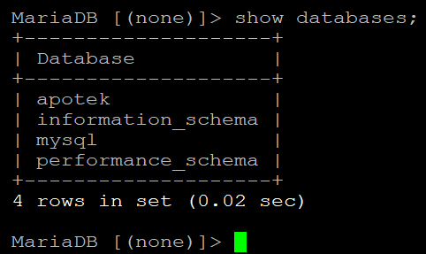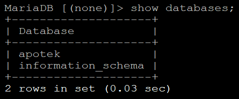 2). Oke Selanjutnya Kita Cek Terlebih Dahulu Database Yang Akan Digunakan Dengan Ketik "show databases;" .