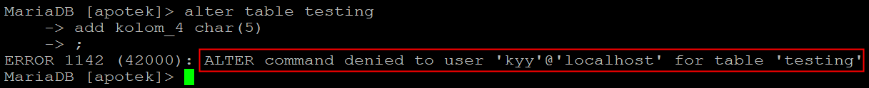 6). Oke Selanjutnya Kita Coba Query ALTER Nya, Dan Ternyata Belum Bisa, Kenapa Ya?Karena Pada Postingan Sebelumnya Saya Belum Melakukan GRANT Pada Query ALTER Atau Bahasa Manusia Nya Belum Mendapatkan Izin Akses Menggunakan Query ALTER.
