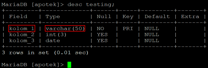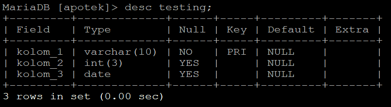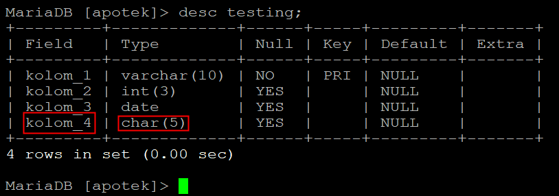 14). Oke Disini Kita Cek Table Nya Dengan Cara Ketik Command "desc testing;", Oke Disini Bisa Dilihat Bahwa Kolom Yang Kita Tambahkan Sudah Bertambah Kedalam Table Yang Kita Buat.