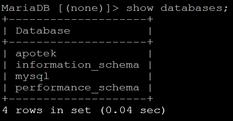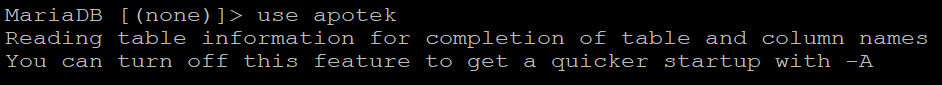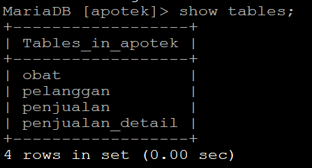 3). USE apotek Untuk Menggunakan Database Tersebut.