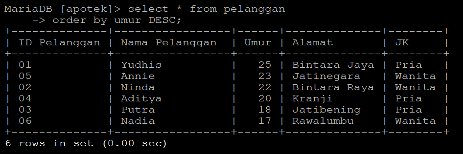 1). Pernyataan SQL berikut memilih semua umur dari tabel "Pelanggan", diurutkan berdasarkan kolom "Umur": Dari Terkecil Hingga Terbesar.
