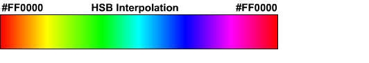 Gradients can be created between 2 or more colours provided. The way the gradient is produced depends on the interpolation strategy used. Generally this is kept to RGB (Red Green Blue). However you may wish to use HSB (Hue Saturation Brightness) by specifying the hsb=true flag.
