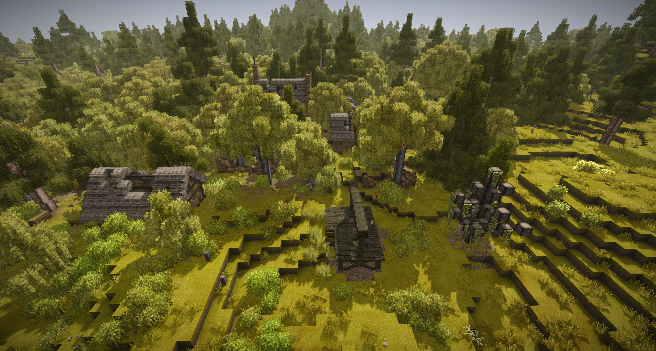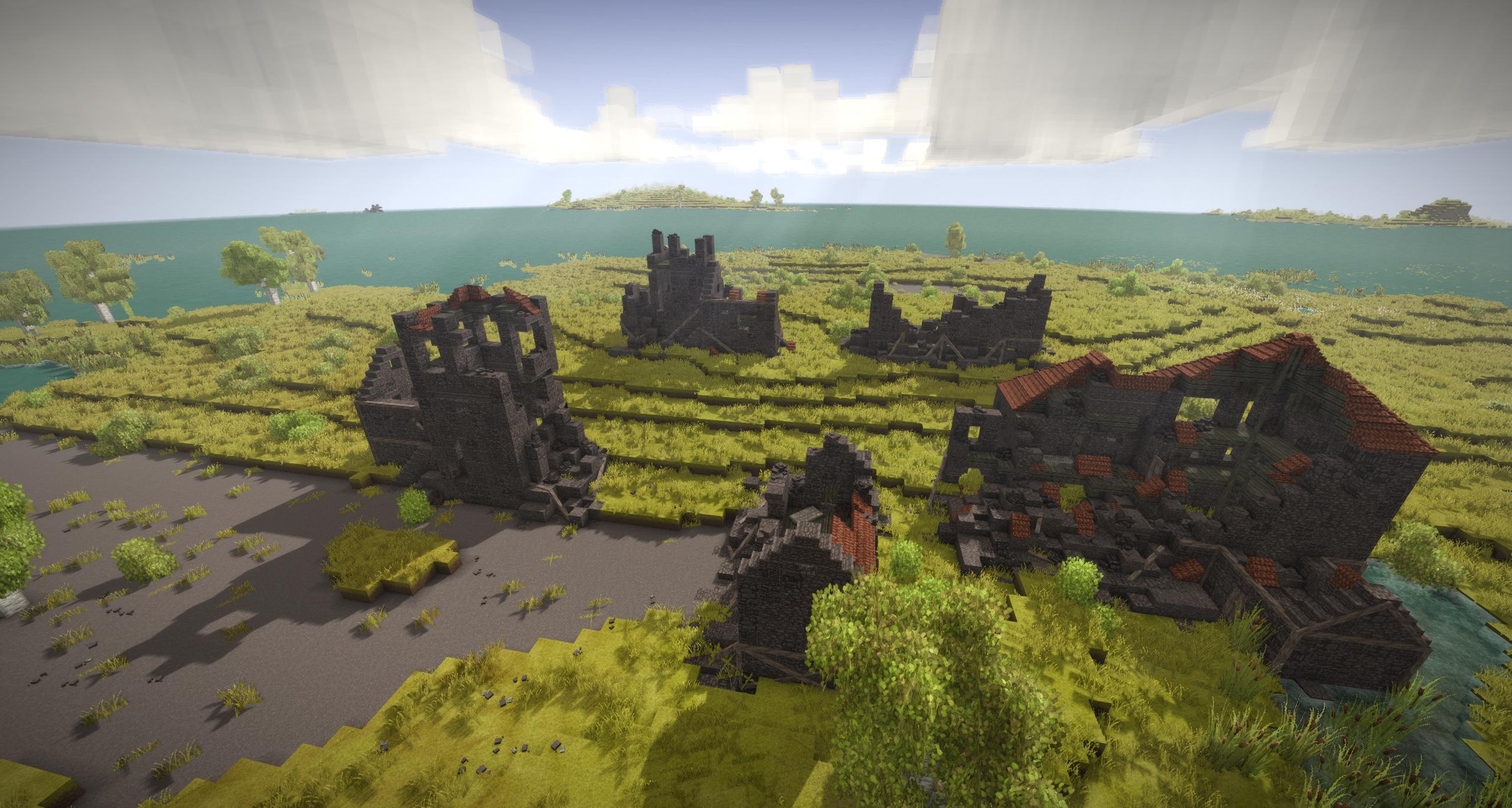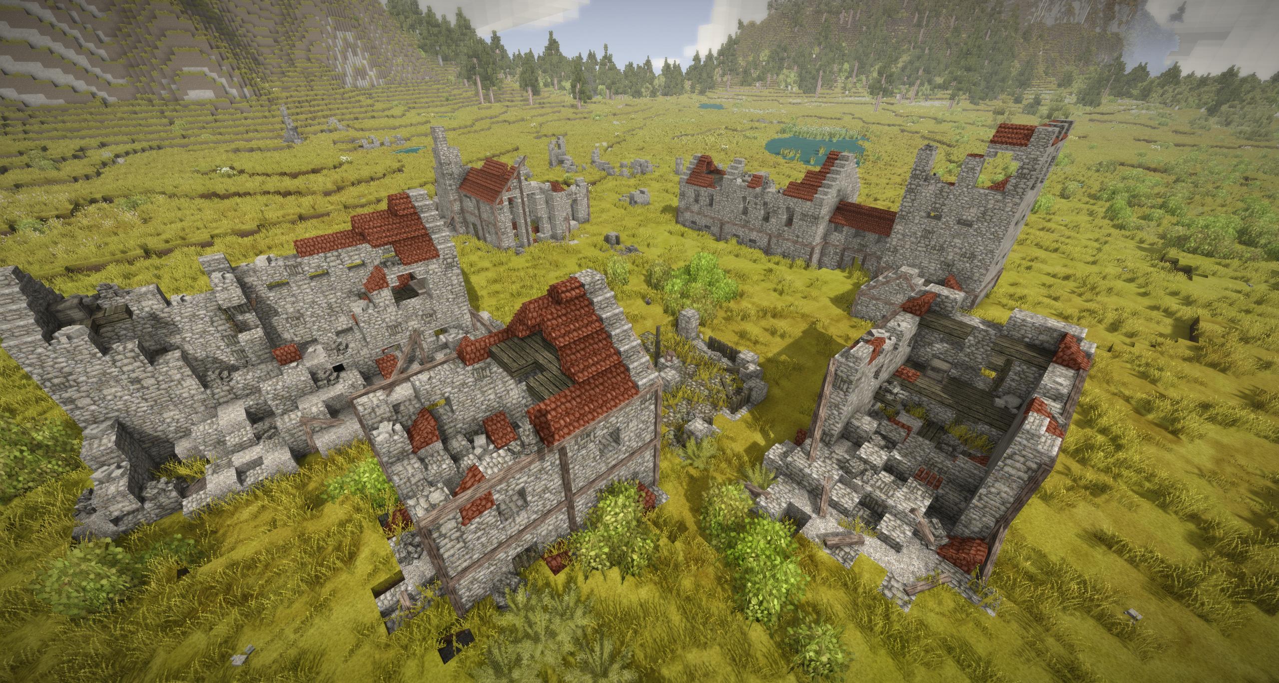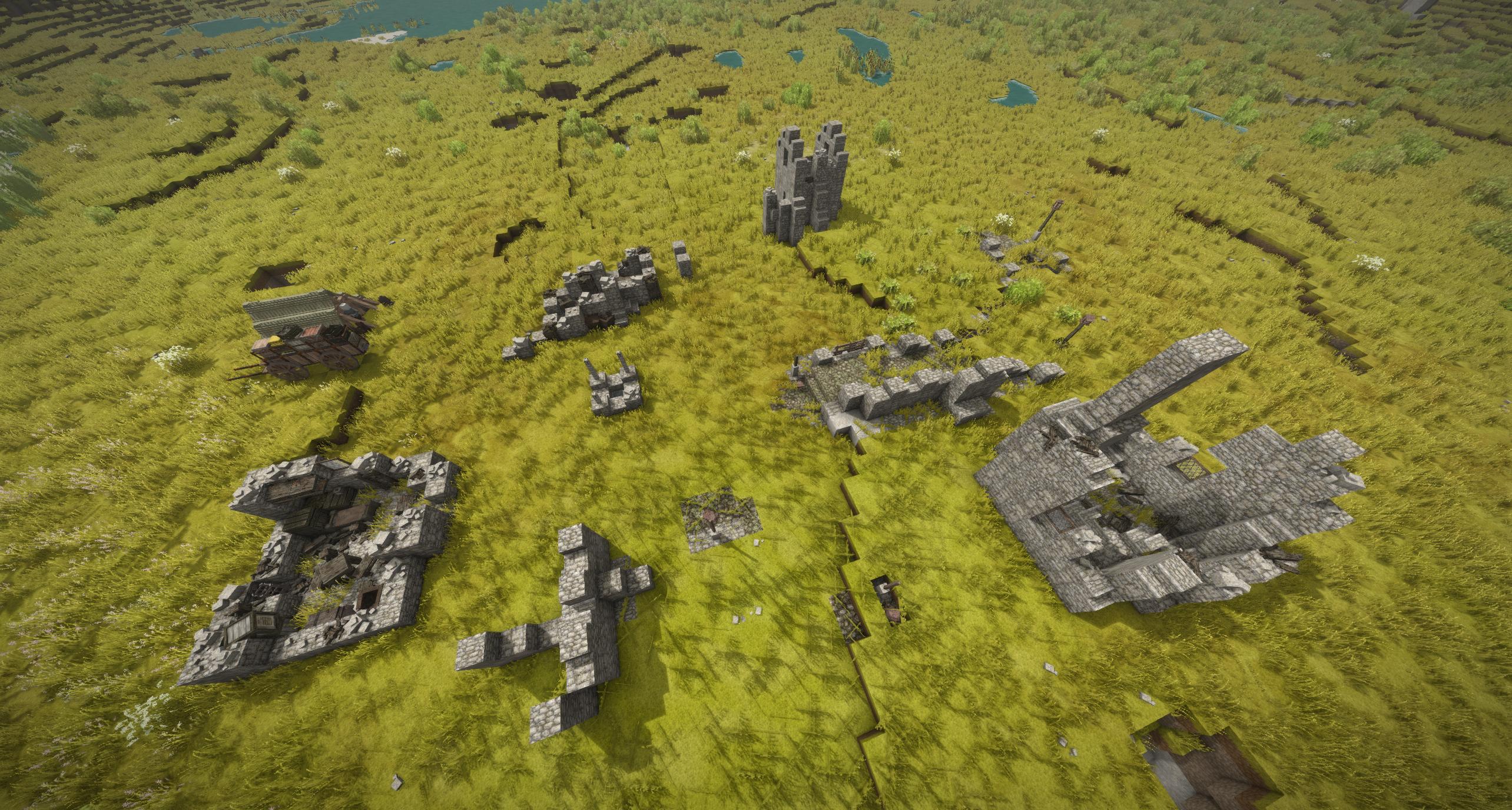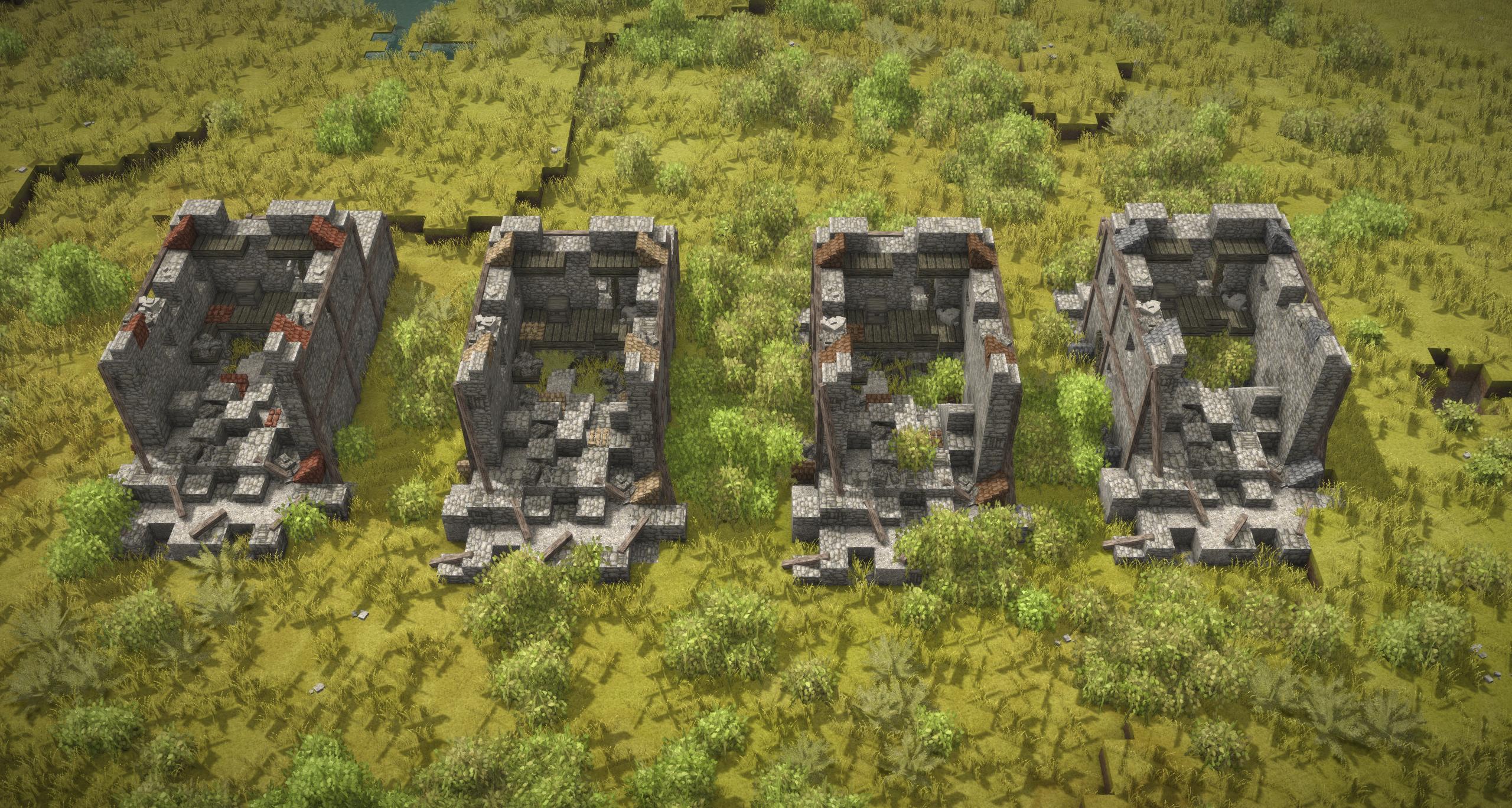 The VSVillage is characterized by its ruined and dilapidated structures, giving the impression of an abandoned or decayed settlement. This village type features a diverse array of buildings, from small houses to larger main buildings, wells, and wall segments.
