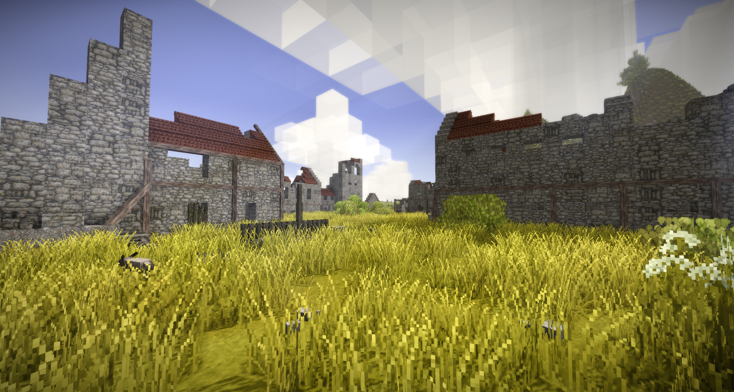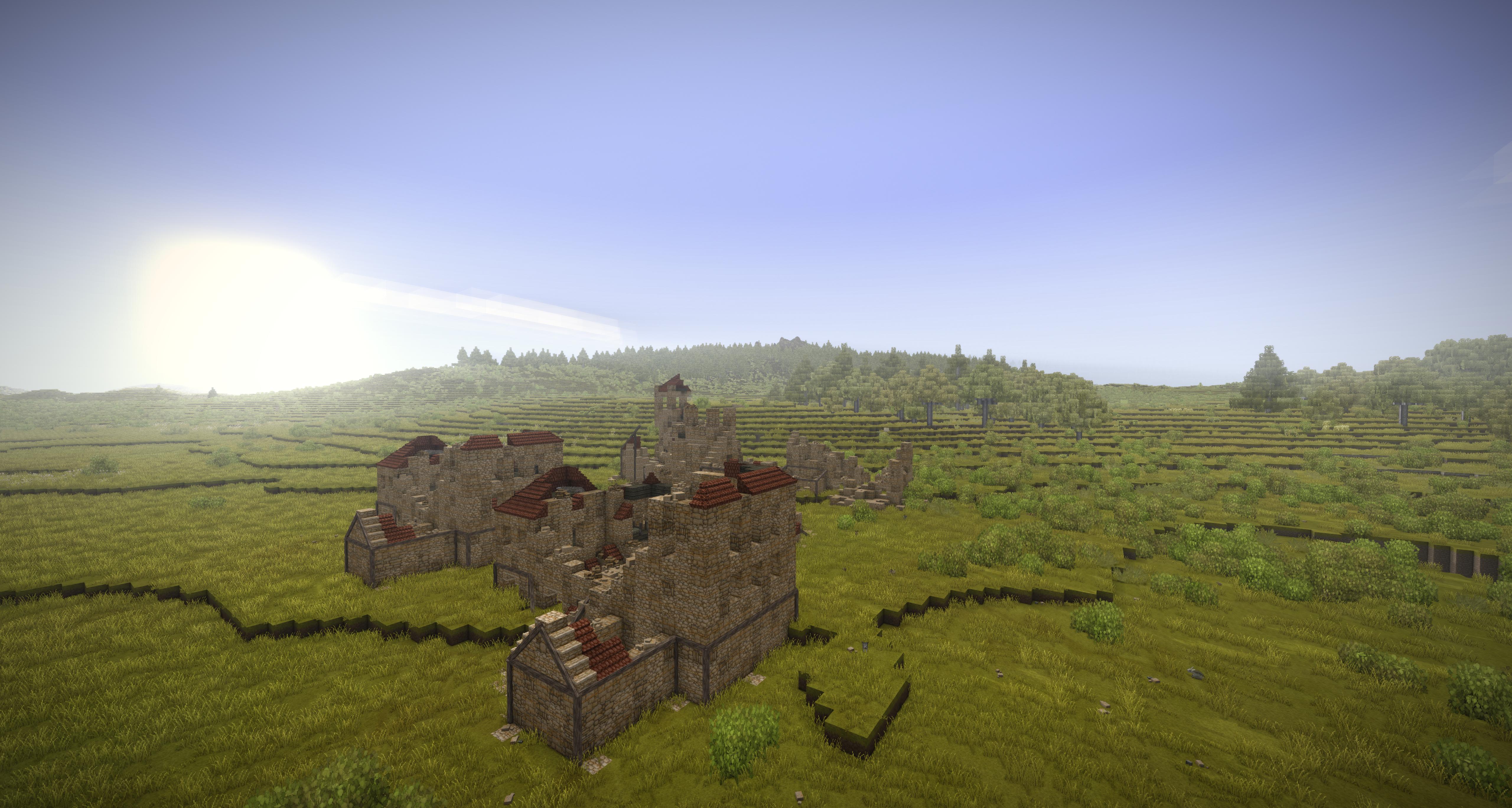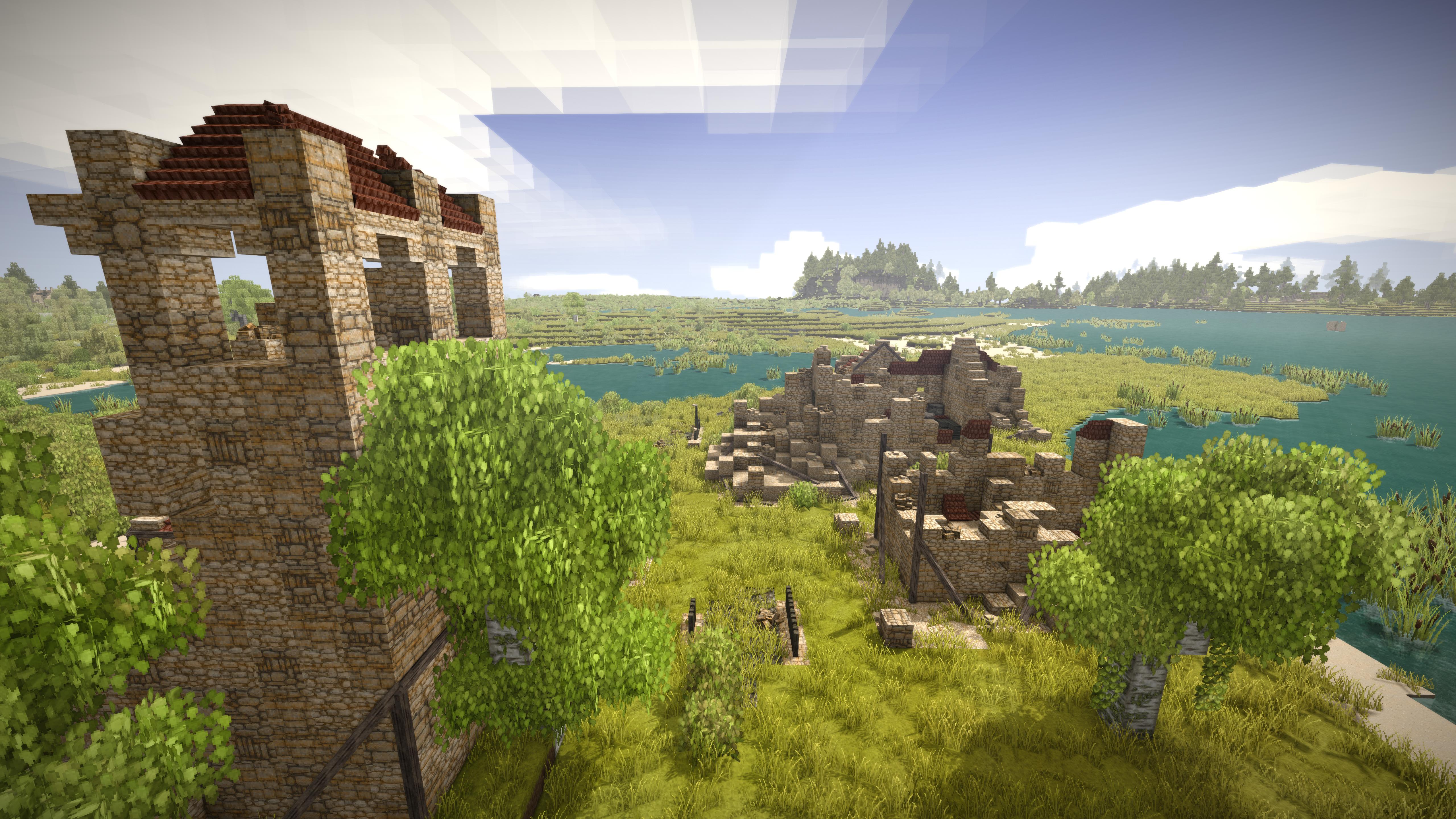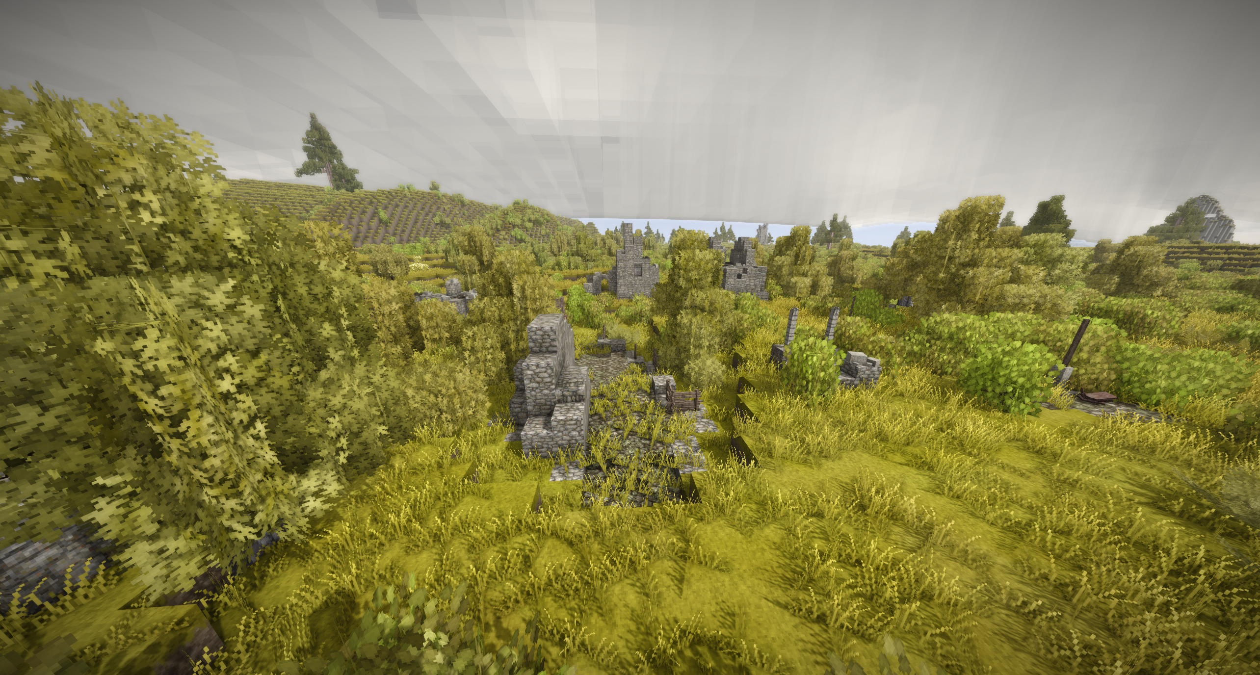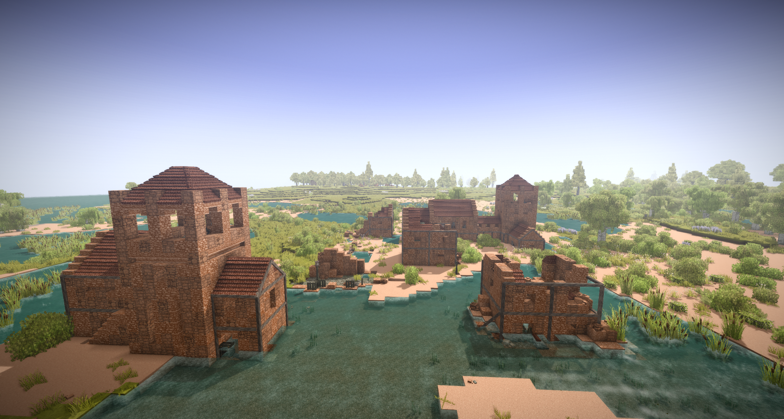 The VSVillage is characterized by its ruined and dilapidated structures, giving the impression of an abandoned or decayed settlement. This village type features a diverse array of buildings, from small houses to larger main buildings, wells, and wall segments.