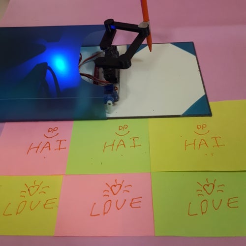 | 2. | Mini Drawing Bot - Live Android App – Trigonometry | Arduino Uno R3 - 1No, HC-05 Blue tooth module. - 1No, Micro Servo - 3 Nos, LM2596 DC to DC Voltage Regulator. - 1 No, 3.7V 18650 Battery - 2 Nos, 18650 Battery Holder. | 3D printed Arm, Small aluminum pipe, Plastic sheet to make cover. | MIT App inventor is used to develop the android app. In the screen a Canvas area is used to draw the line drawing once you start draw the Mini drawing bot also start to draw with you. Pattern drawn in bottom half is only drawn by the bot because of the length of the arm. | https://www.instructables.com/Mini-Drawing-Bot-Live-Android-App-Trignomentry/ |