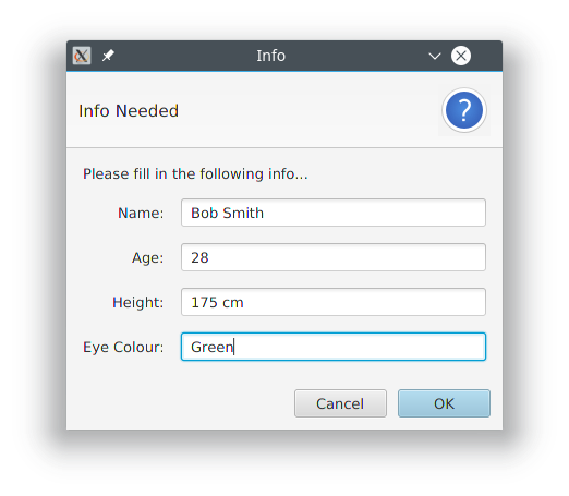 );Like with GUI.choiceWindow you specify the fields you want the user to be presented with by adding their names after the first three normal arguments. When submitted, all the user-input are returned as an array of strings (in the order the fields were specified). For example: