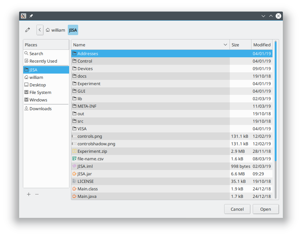 Address selected = GUI.browseVISA();When the user selects an instrument from the list, it will return its address as an Address object. If the user presses "Cancel", it will return null.