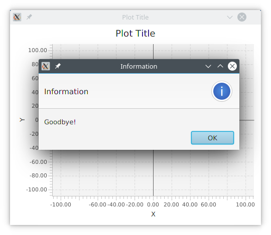 }In the above example, trying to close the window will cause a dialogue box to pop-up saying "Goodbye!" before the program exits, like so: