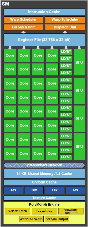 Each SM features 32 single-precision CUDA cores, 16 load/store units, 4 Special Function Units (SFUs), a 64KB block of high speed on-chip memory and an interface to the L2 cache.