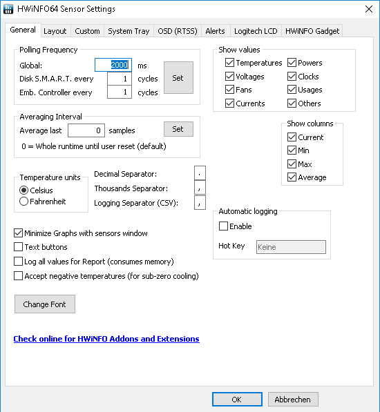 For Windows we need additional Software to be able to read the temperatures of the Remote-PC. I decided to use HwInfo, since it is reliable.(Download) But this isn't enough to read the temperatures, since we need some interface to work with and I decided to provide the data via Webserver in json-Format. There's an AddOn for HwInfo, which exactly does this job, called RemoteSensor Monitor, Download it from HwInfo-AddOn-Page, create a folder (C:\Remote\) and put the AddOn in there.