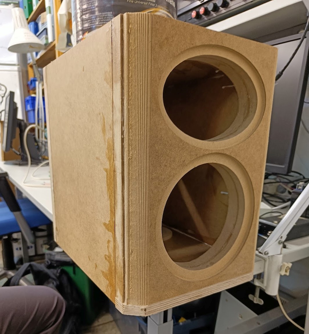 | Enclosure before sanding. Note the plywood chin, which is due to the panel being misaligned in the CNC. |