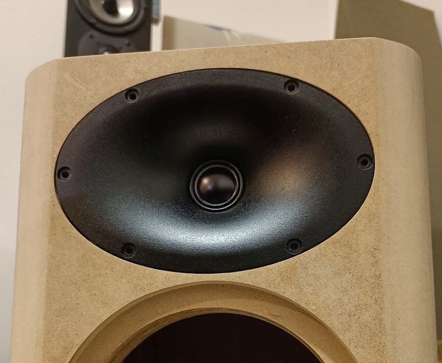 We use the SomaSonus SB26 waveguide for the tweeter (noPS, 6" version). The waveguide is 3D printed, since that is the method we have at hand and it's cheap. Filament is wood-filled PLA since it's quite easy to sand down, as well as paint. A clamp was also designed to better attach the tweeter to the waveguide. The clamp can be 3d printed using basic PLA with low quality settings.