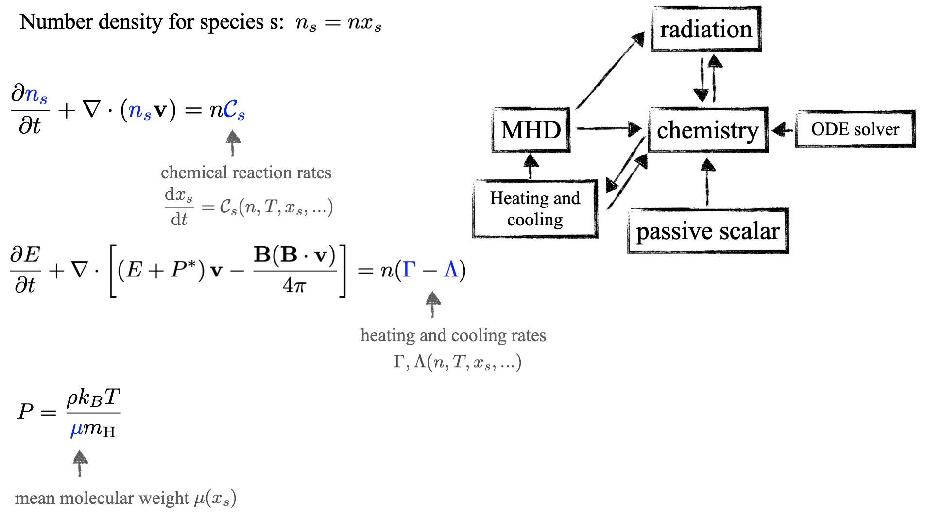 Note that the passive scalar advection (and diffusion) is solved separately prior to the chemical rate equations. This operator split method is only first-order accurate. The conservation of elemental abundances (such as by rescaling the flux of different species) has not been implemented yet.