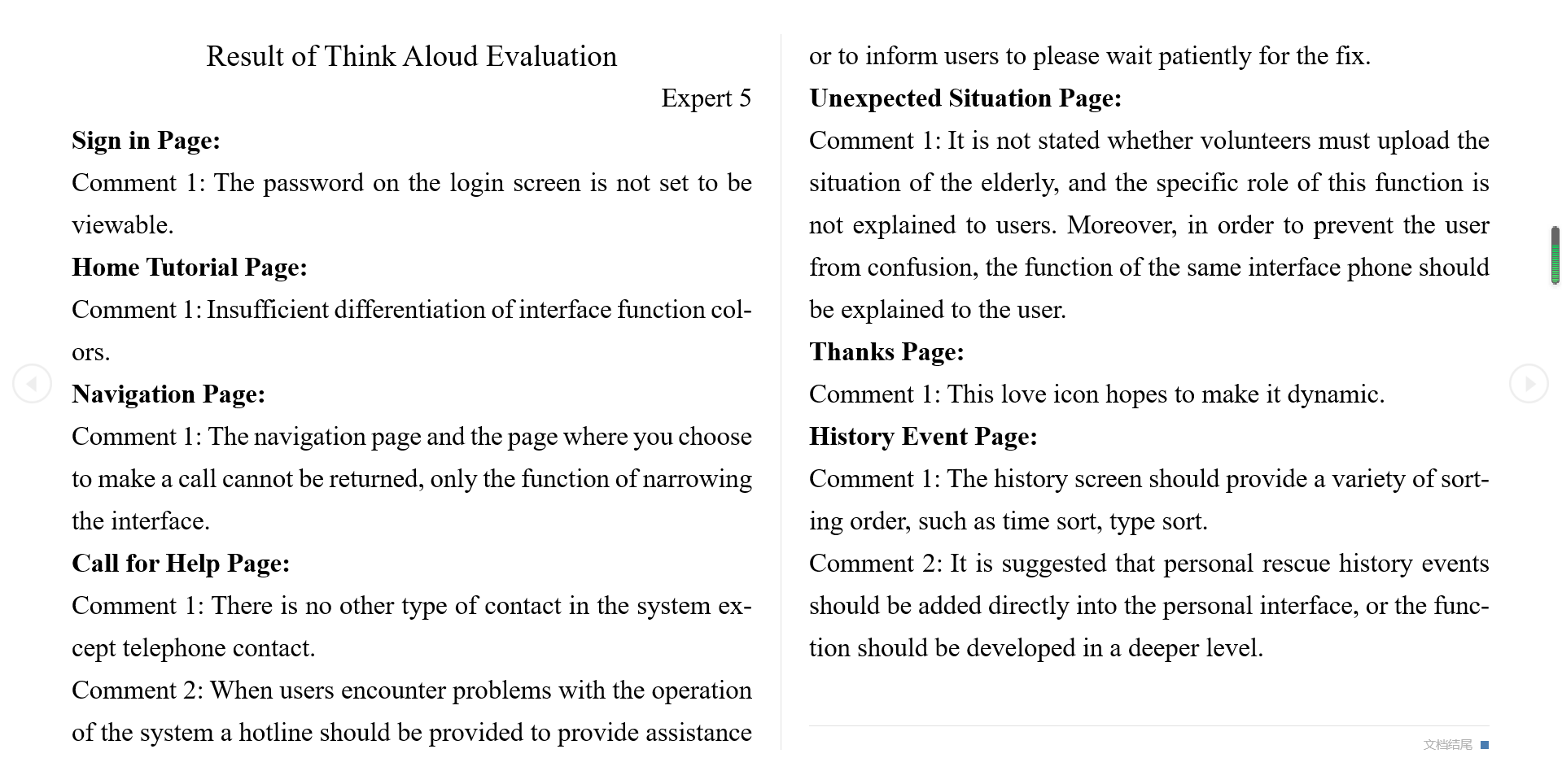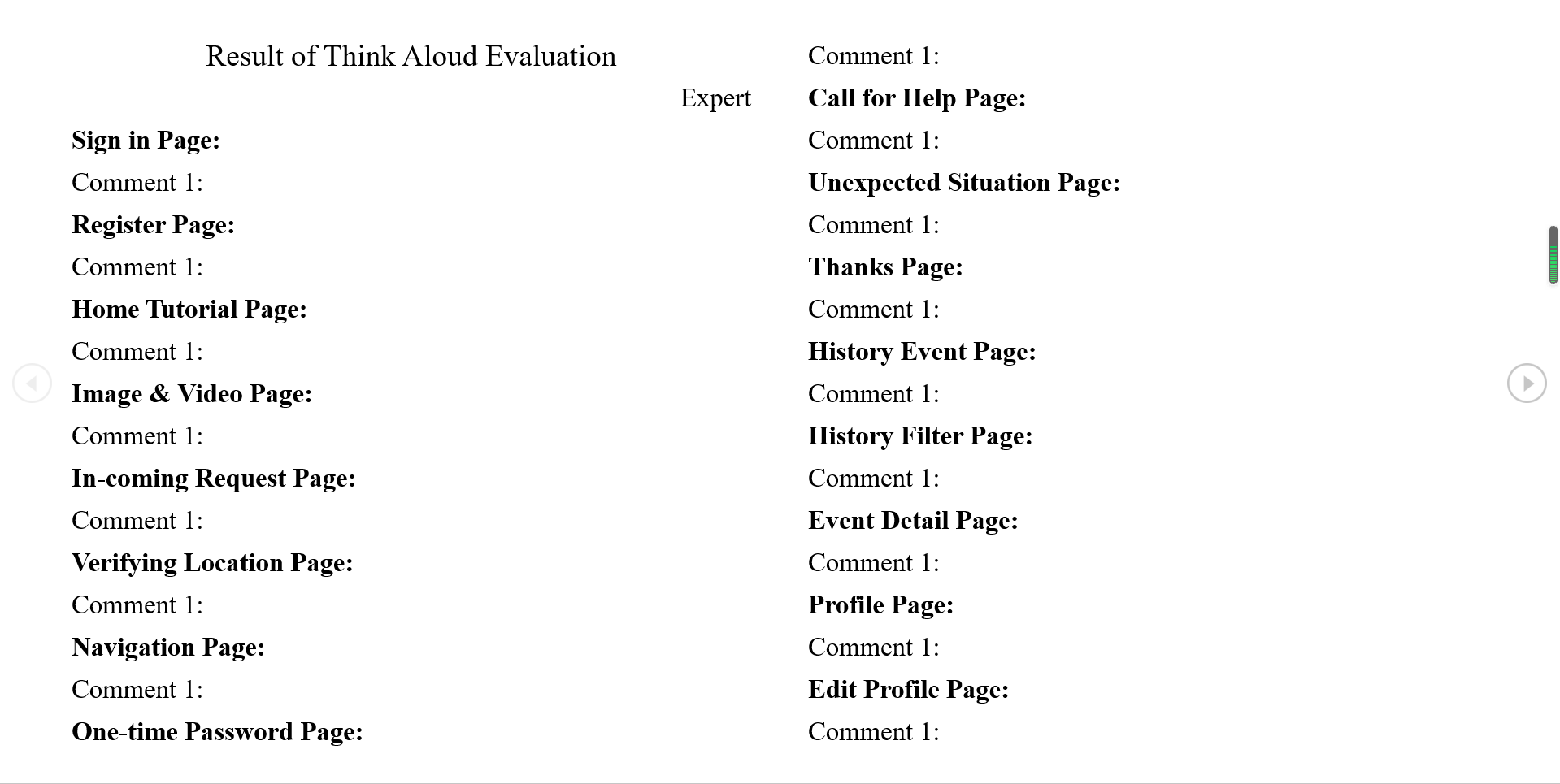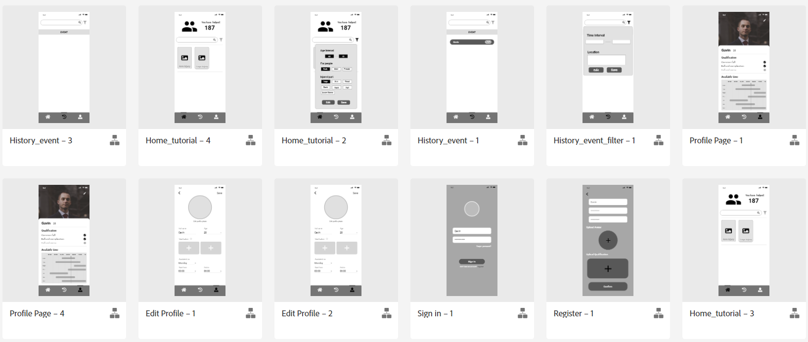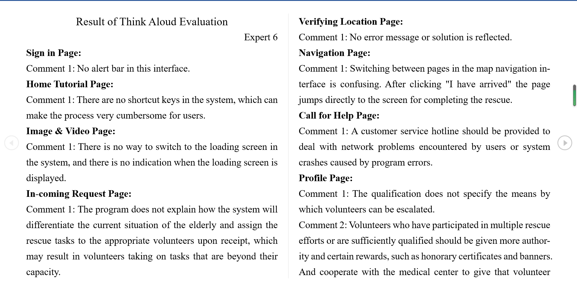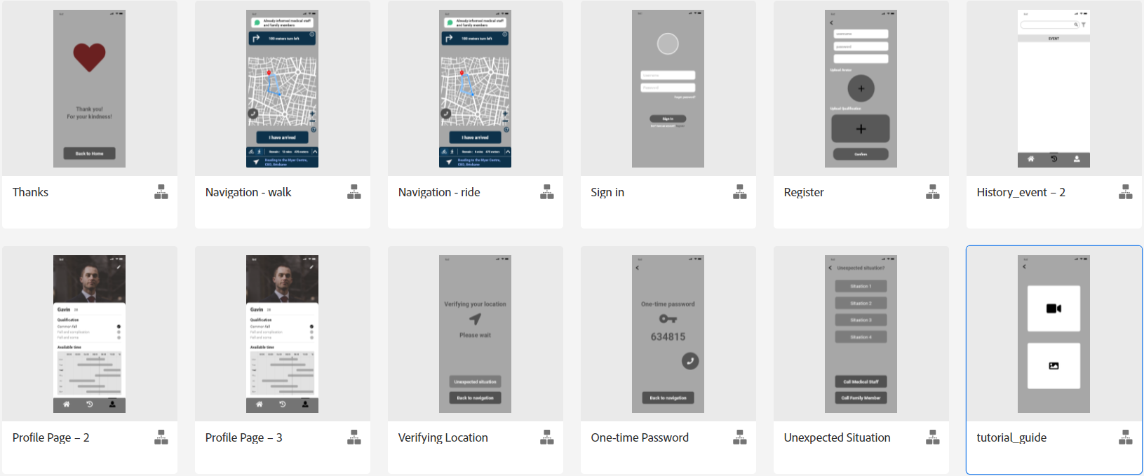 - This participant looks through some pages for no more than 1 minute, such as the "Sign in the page", "Register page", "History Event page", "History Filter page", "Profile page", "Edit Profile page", "Call for Help page", "Unexpected Situation page" and the "Thanks page".