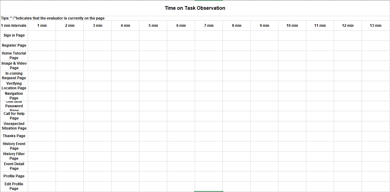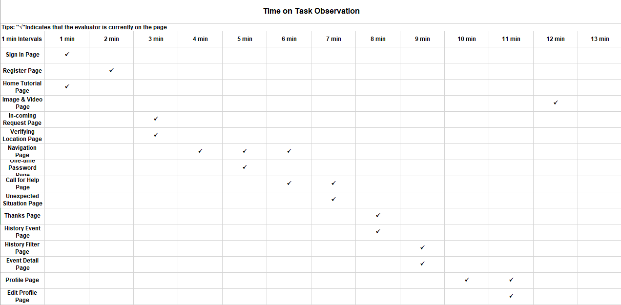 - This participant spends no more than 1 minute on "Sign in page", "Register page", "Home Tutorial page", "In-coming Request page", "Verifying Location page", "One-time Password page", "Unexpected Situation page", "History Event page", "Thanks page", "History Filter page", "Event Detail page" and the "Edit Profile page".