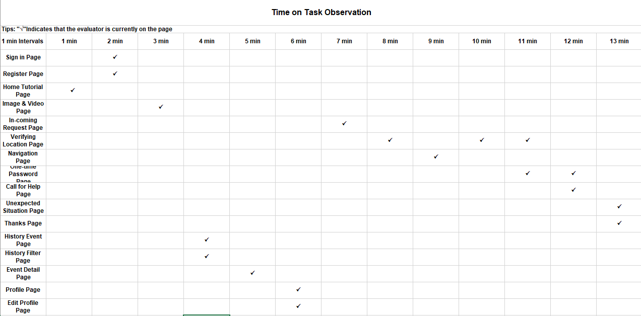 - This participant spends no more than 1 minute on the "Home Tutorial page", "Verifying Location page", "One-time Password page", "Unexpected Situation page", "History Event page", "Thanks page", "History Filter page", "Event Detail page" and the "Edit Profile page".