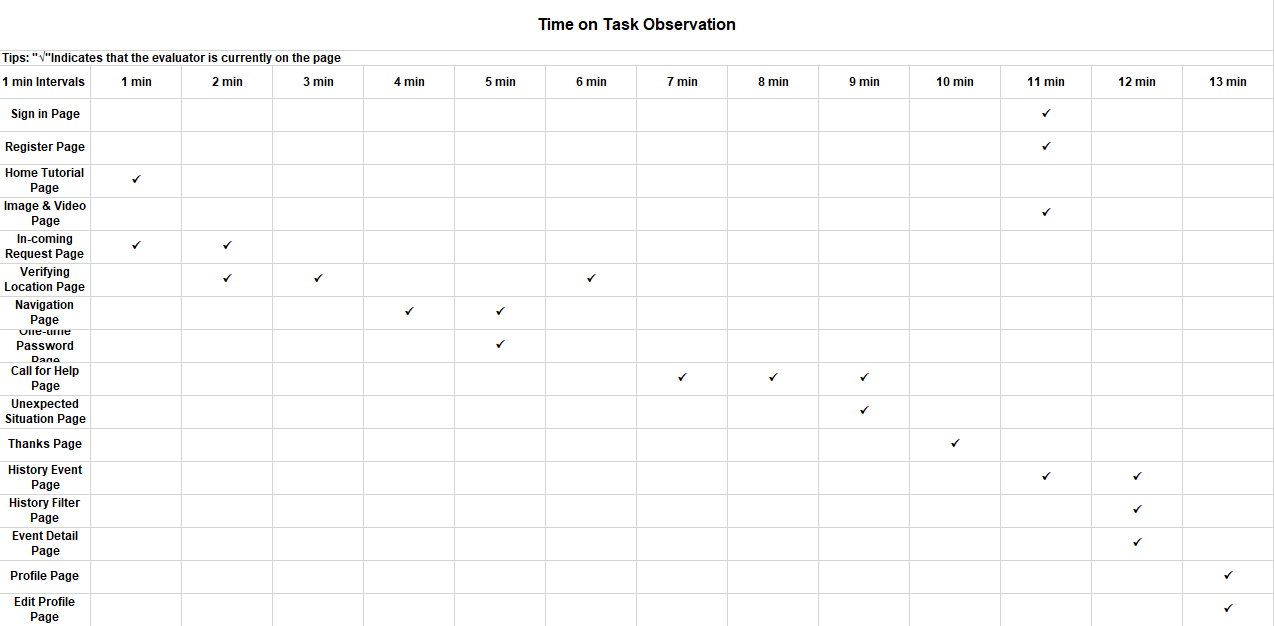 - The participant spends less than 2 minutes on the "In-coming Request page", "Navigation page", "Call for Help page" and the "Profile page".