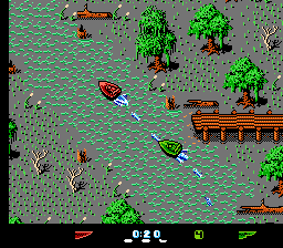 Eliminator Boat Duel is a duel racing game. It's very well done. It has a side view on start/finish with really big sprites for NES, as well as top-down and 3rd person view during the race itself (all that during a single race). You race against the computer and can have 5 to 8 rivals depending on skill level. You can also play in 2 player mode versus your friend. You earn money by winning as many track sections as you can, completing races under certain times, collecting "$" items, and sinking your rivals. Upgrades are available in the shop to make your boat move or accelerate faster, steer smoother, or have stronger hull protecting from some damage.