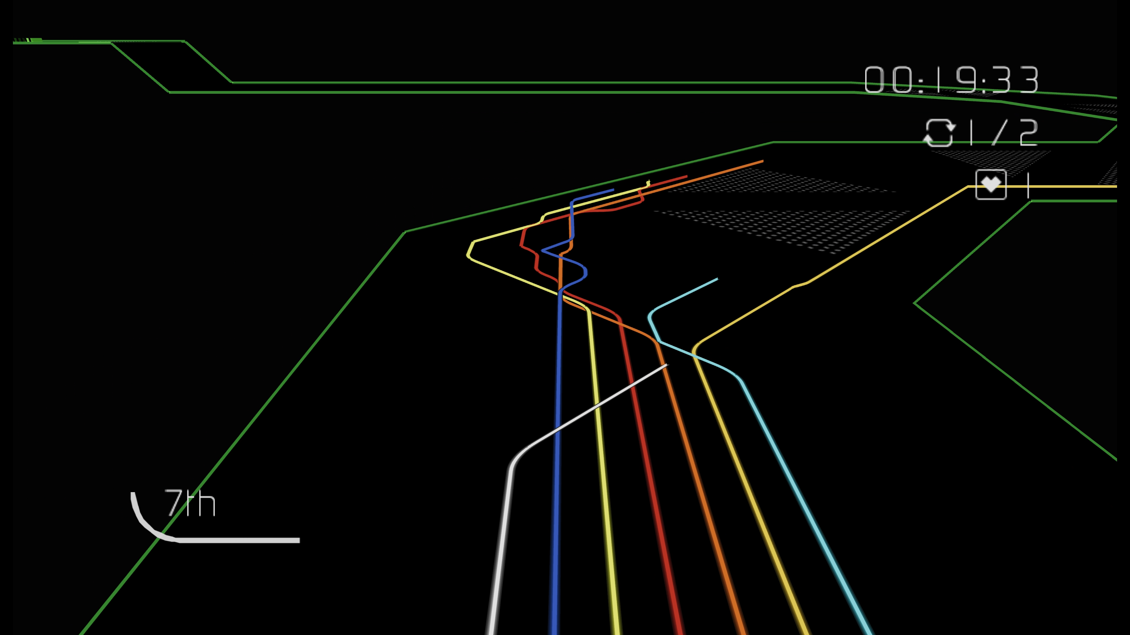 The gameplay gives a lot to work with as well. You race as a point on a line along with everyone else, leaving a light trail as you go. You can temporarily go into lanes that already have a light trail, but it pushes you out into the nearest empty lane or hazard, and it becomes strategic to force opponents into a hard collision or patches in the road that reduce speed. There are multiple ways to get a boost, including panels on the floor, using a pickup, or sacrificing durability for a quick burst. You also generate a different kind of boost by cruising next to an already set line, but if you’re in first place, then there is no line to cruise along to build boost. All these mechanics could inspire all kinds of achievements along with time challenges. You could avoid taking damage, avoid certain kinds of boosts/powerups, or trap another racer.