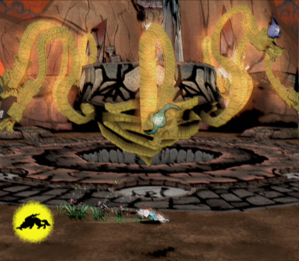 After making each head drink the 8 Purification Sake, Orochi will become drunk. Attack the bell on his back, and once its health has been reduced enough Phase 2 will start. You will repeat the same tactics, attacking each head. This time, the heads have more physical attacks (Such as a left and right swipe attack and a lunging bite attack) and the bell will be shooting fire downward in different directions intermittently. Stay to the back of the arena to bait the head into lunging towards you, while keeping your distance from the fireballs being dropped from above. Make each head drink the 8 Purification Sake again and unleash all your attacks and kill each one.