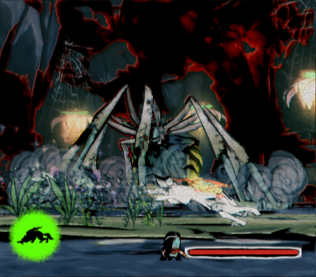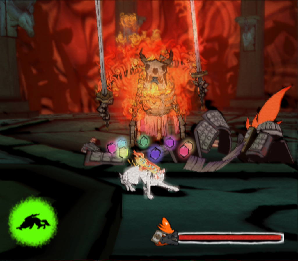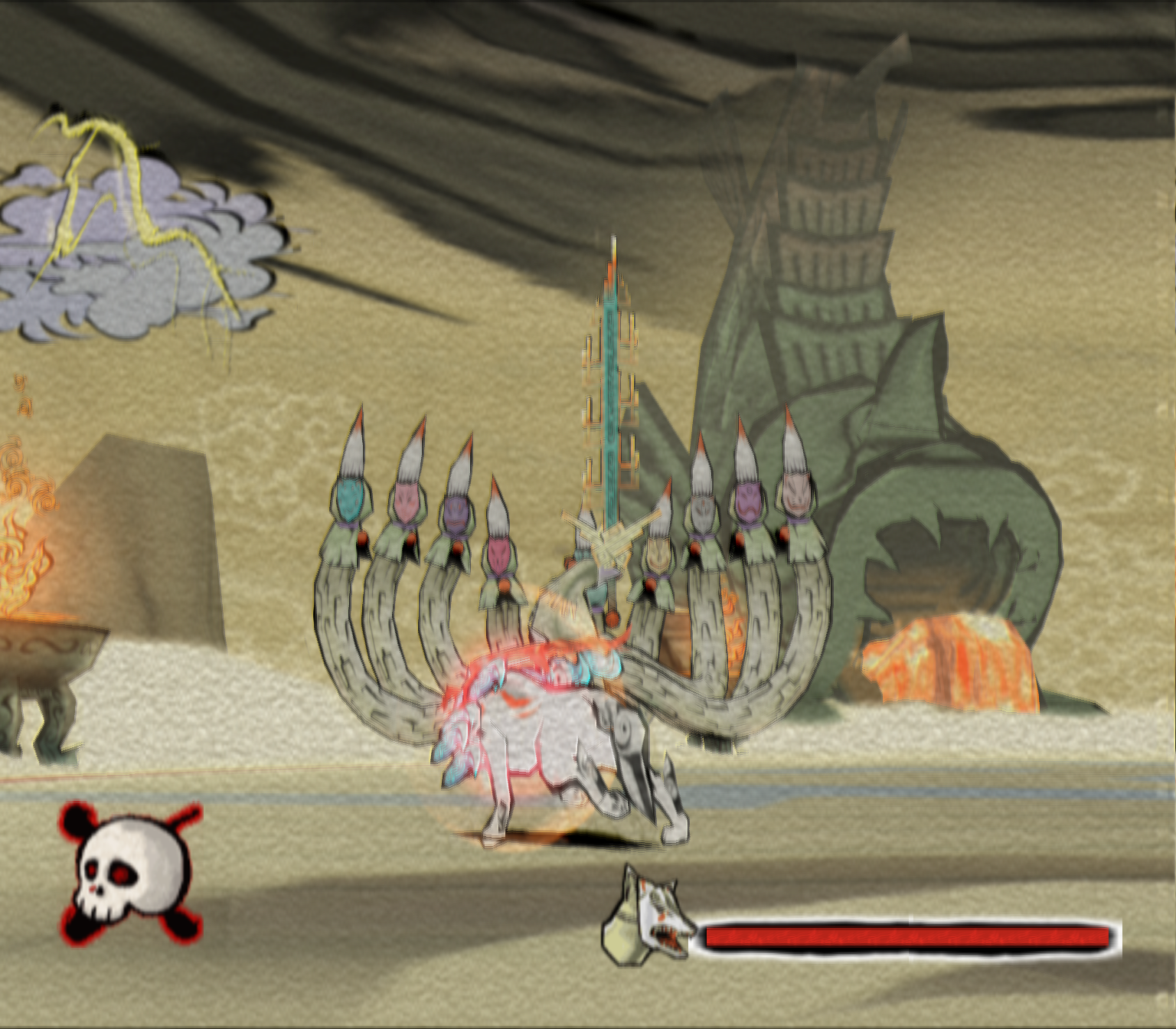 New boss fight; this is more of an RNG puzzle than the other fights. Both owls have attacks that can be fired back at them, focus on doing that and countering all of their attacks with Power Slash (all but ice). Lechku (Gold) will hold up his sword occasionally, make sure to strike him down with lightning, here's a tip; now that you have Thunder Edge you can use it to cast Thunderbolt from Amaterasu to whatever you wish to strike with lightning, this way you don't have to worry about your position in proximity to the nearest cloud. Nechku (Silver) loves throwing bombs your way, make sure you steer clear or them or explode them on your own with fireburst. You'll be prompted eventually to shoot Oki out like a cross-bolt, knocking one of them down. Feel free to go crazy and deal as much damage as you possibly can. Be weary of their dive attacks, the worst part is how it can change the camera. Try to double jump over or strafe/dodge out of the way in time. If you're worried about the timing, keep a bit of ink left to do veil of mist. Rinse and repeat until both are vanquished.