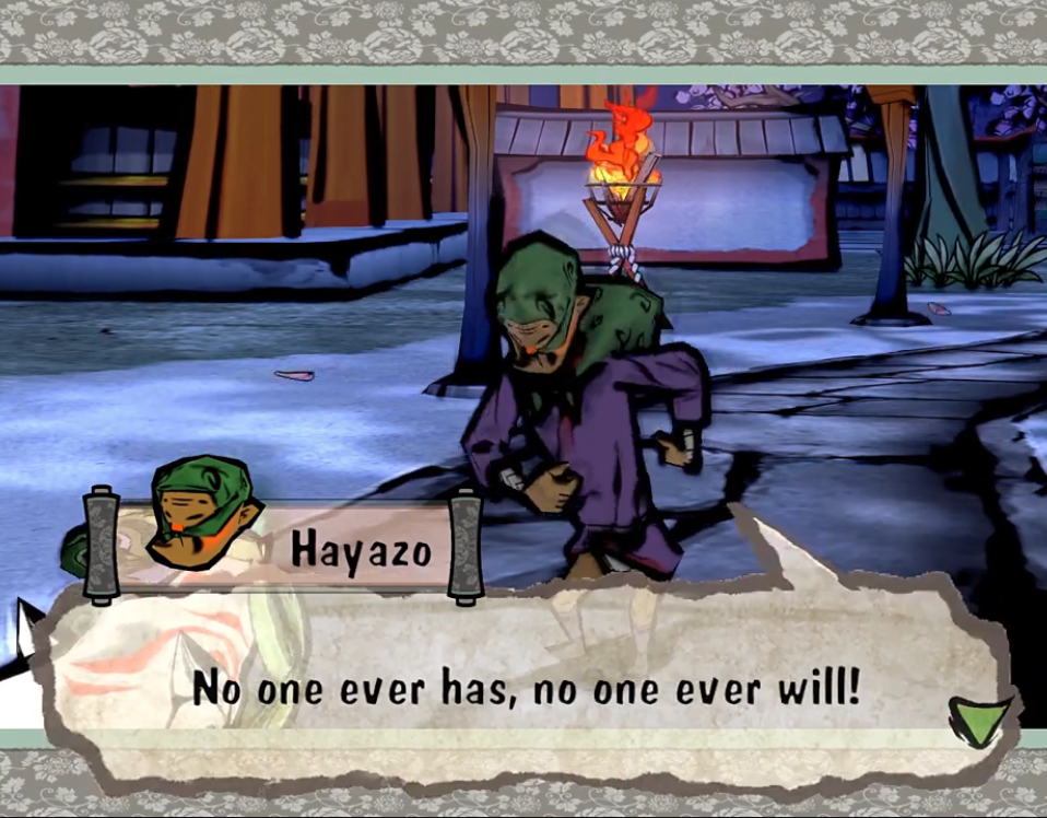 Several items in Sei'an City's Commoner Quarter have gone missing! The culprit is of course, closer than you think. Light every torch around the City, and use Power Slash on the giant boulder standing beside a soldier keeping watch. Hayazo the thief will pop out and challenge you to a race. There are four races in all, each rewarding you a different item upon completion. Hayazo has 4 forms, all weak to various brush strokes