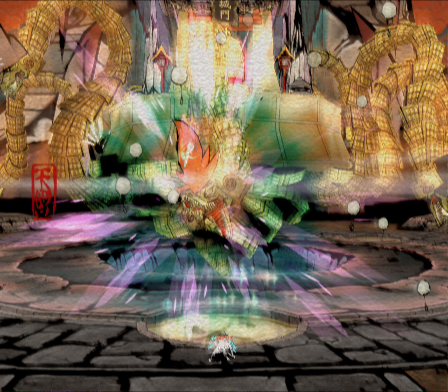 Bit of a tricky fight to get down on your first attempt. Ninetails will hold his sword up as the fight starts, so make sure you make use of the lightning surrounding the area. Ninetails is invincible otherwise, but once he is hit by lightning he will split into multiple forms of Evil Rao. If you have the Fireburst technique already, this would be the time to use it as it attacks multiple enemies in an area. If you do not have it, the easiest way to start taking out the Evil Rao's is to line them up in Brush Mode and strike them with a power strike and, of course, dropping cherry bombs on multiple groups when possible. The time for this fight is a little more generous than it would seem, so don't stress if you miss one or two. Once all are defeated, Ninetails will turn into his true form and will be vulnerable to damage. He will try to charge you with a spinning strike - double jump out of the way enough times and he will get dizzy. Proceed to lay into him accordingly.