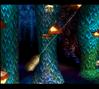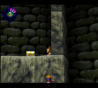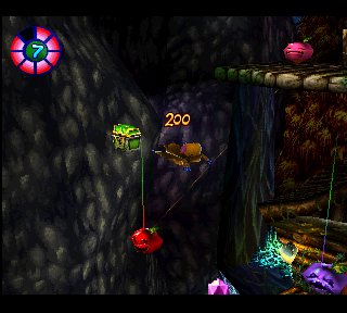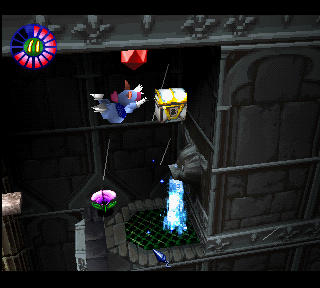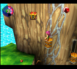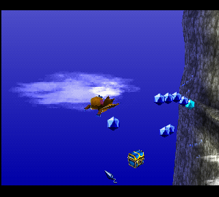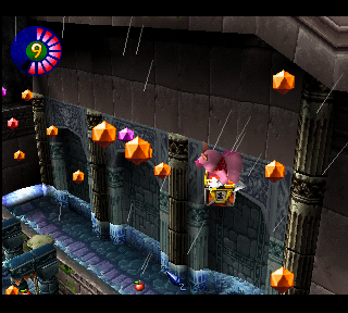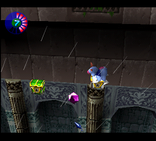 If you climb back up the stone structure's roof, you'll see one more gem in the distance (above the seesaw from the first leg of this foreground path). You can get it more easily with the Bird Suit (earned by grabbing the lure stuck to the roof of the stone structure), but you can also reach it by taking a huge leap from the structure's roof to the left, grabbing the swing bar, then jumping up from it to the crank.