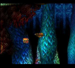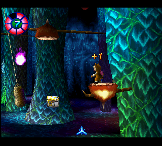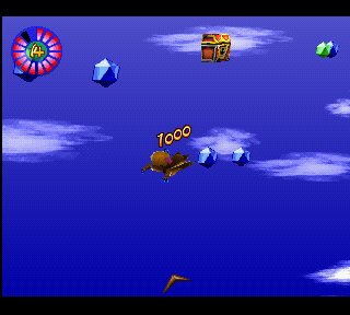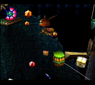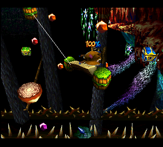 From either end of the first seesaw, you can leap from the barrel at its highest point to collect two floating gems per side.