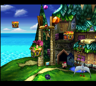 The platform to the right of those last gems contains the entrance to Mizuno's Hut. If you walk off the left and float down, you'll see a bouncy platform with a ladder leading to the Artist's Atrium. You'll see two gems, one close and one further down - you'll have to retrace your steps after grabbing the second.