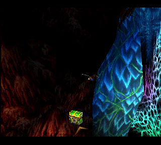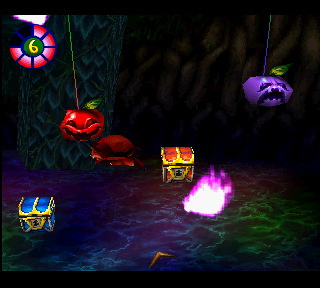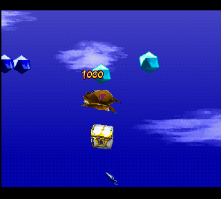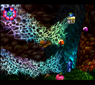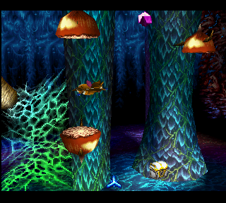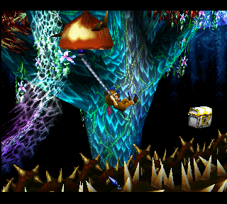 Return to the foreground area, then go through the door at the far right (near the crab from which you stole the Crystal). As soon as you enter the area, jump up to the ceiling for three hidden gems.
