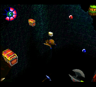 On the left side of the first area, there are three gems near the water, leading into a cave. Since you can't swim in these waters until the Evil Ghost Pig is defeated, I've chosen to skip these gems for now (even though they can be grabbed with the Grapple or just by allowing yourself to drown).