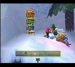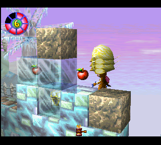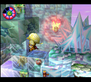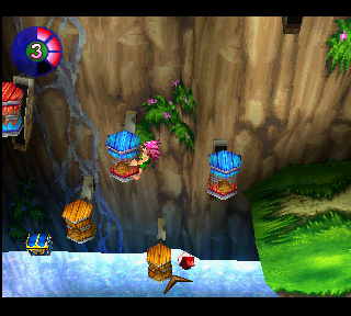 If you fly further to the right, you'll pass over an Ice Anemone and land on a mountaintop area. Clear out all the enemies here (you'll need the Fire Hammer to defeat the Ice Anemone for good, but you can just feed it an enemy and freeze it for now). Continue right up the side of the mountain to find a rope - pulling on it will drop a bunch of snow, turning Tomba into a snowball and rolling him down the mountain. As you roll down, hold right to reduce your speed (otherwise you'll bounce too early and break the snowball). Near the end, as you approach the Ice Anemone, hold left - this should throw you up into the air, land on the trampoline from earlier, and bounce high into the clouds. This will net you three gems (plus a full Pot of Life).
