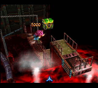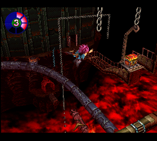 Continue beneath the metal walkway, passing by the fire-breathing enemy. There's a gem floating near a chain.