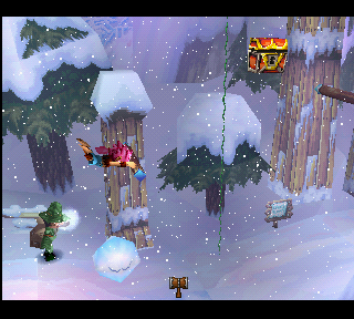 With the Squirrel Clothes equipped, find a nearby fork and move into the foreground. Collect the Big Sack from under the snowpile (return it to the Chimney Shed later), then climb to the top of the icy pole. To the left is a floating red chest with a gem inside - if you don't catch it mid-air, it'll wait for you on the ground below.