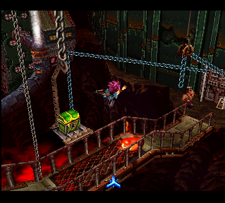 There are two chain lengths hanging beneath the bridge to the hot spring - grab onto the right-hand one to pull it down, lower the bridge, and bring up a Mudball Surprise on the left. Climb down to collect a gem (as before, the gem on the left can't be safely collected without the Grapple, so ignore it for now).