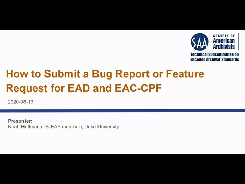 Requests may be submitted using the Web form at (https://www2.archivists.org/standards/TS-EAS-report-an-issue). The form is also available on the EAD and EAC-CPF websites. Submissions should detail the issue, including information on reproducing the bug and your institutional operating environment. Suggestions for rectifying the issue may also be included. This information will then be transferred to GitHub by the subcommittee for tracking purposes.