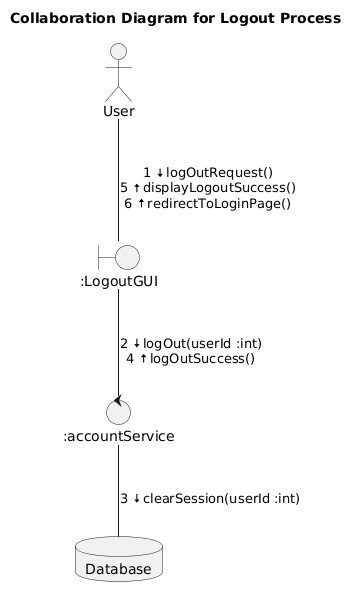 This is the collaboration diagram for logging out. It is a straightforward process where the user confirms a log out in the gui before being removed from their session and placed back to the log in page. There are no alternative paths for this process.
