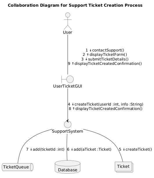 This is the collaboration diagram for a user creating and submitting a support ticket. The user enters the ticket details in full and submits it. The ticket is added to the database and ticket queue for an admin to resolve later. The user is then notified of the ticket creation being completed. It is assumed that the ticket fields are validated before being sent.