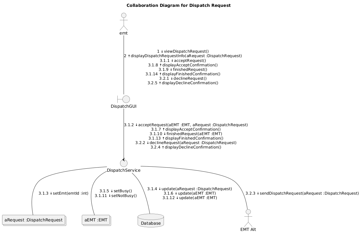 This is the collaboration diagram for an EMT handling a dispatch request (sent by the nurse in the triage). The EMT will check the request and decide whether or not they are equipped to handle it. In the scenario where the EMT can not handle the request, the request is sent to the next nearest EMT to the request location and the process starts again from step 1. In the scenario that the EMT can respond to the request, the EMT accepts the request on their UI and the system ensures the EMT will not get assigned requests while they are resolving the current one. Upon finishing the request, the EMT interacts with the ui to declare the request as complete. The request is then marked as complete and the EMT is then marked as open to further requests. Just like the sequence diagram, the EMT actor can represent an EMT team or a team leader in charge of organizing requests.