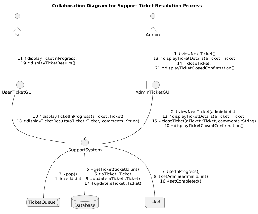 This is the collaboration diagram for an admin resolving a support ticket. The admin gets the next ticket in the queue, changing the ticket to an "in progress" state. The user is notified of this while the admin works on completing the ticket. When the ticket is reolved, the admin can mark the ticket as finished with optional notes to send to the user. The ticket is moved to a "resolved" state and the user is then notified that their ticket has been resolved (or not, in which case the notes would explain why). Finally, the admin is shown confirmation that the ticket has been changed to a resolved state.