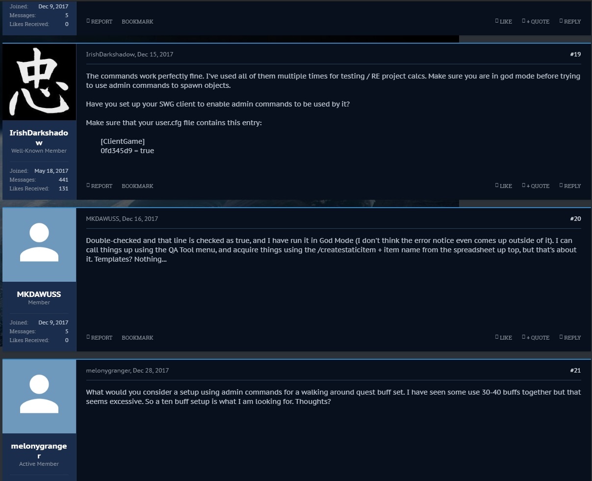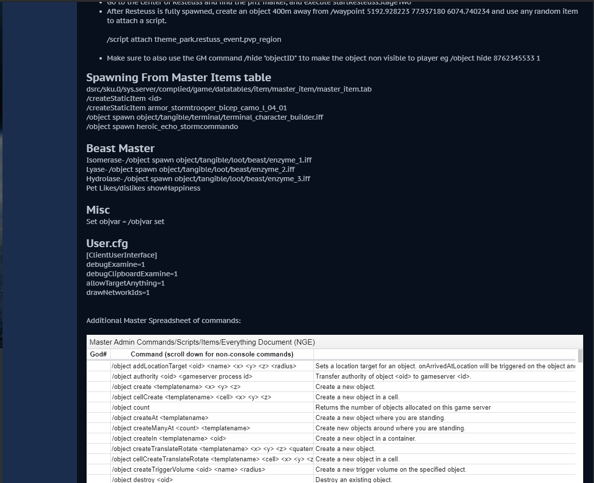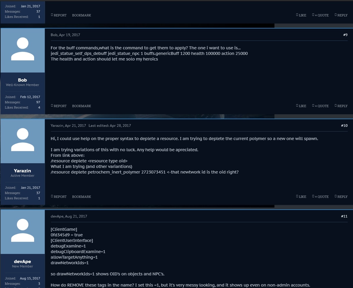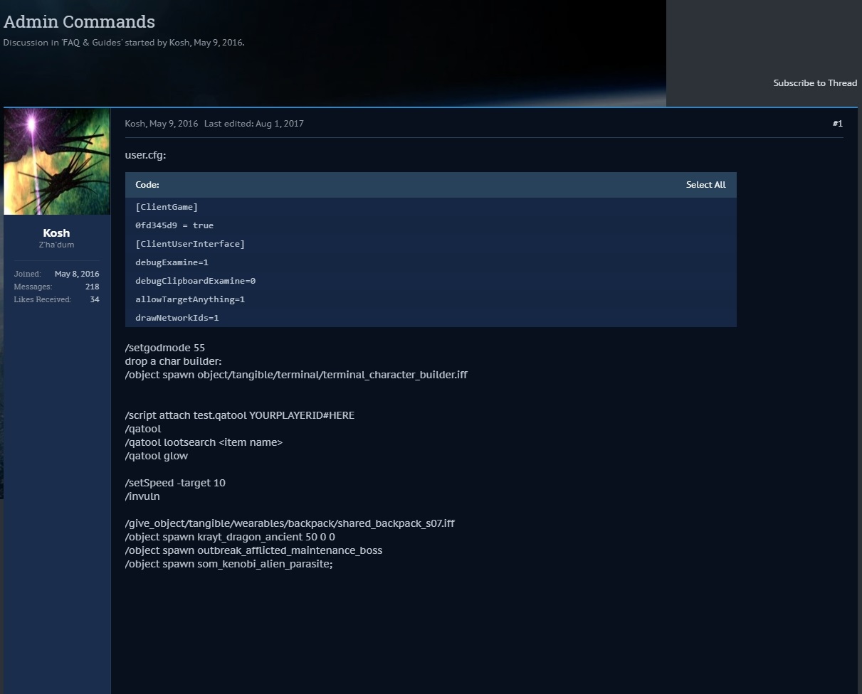 Subscribe to Thread Kosh Kosh Z'ha'dum Joined:May 8, 2016 Messages:218 Likes Received:34 #1Kosh, May 9, 2016 Last edited: Aug 1, 2017 user.cfg: Code:Select All [ClientGame] 0fd345d9 = true [ClientUserInterface] debugExamine=1 debugClipboardExamine=0 allowTargetAnything=1 drawNetworkIds=1 /setgodmode 55 drop a char builder: /object spawn object/tangible/terminal/terminal_character_builder.iff