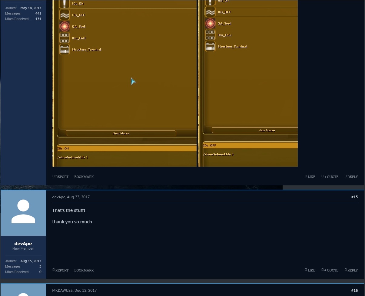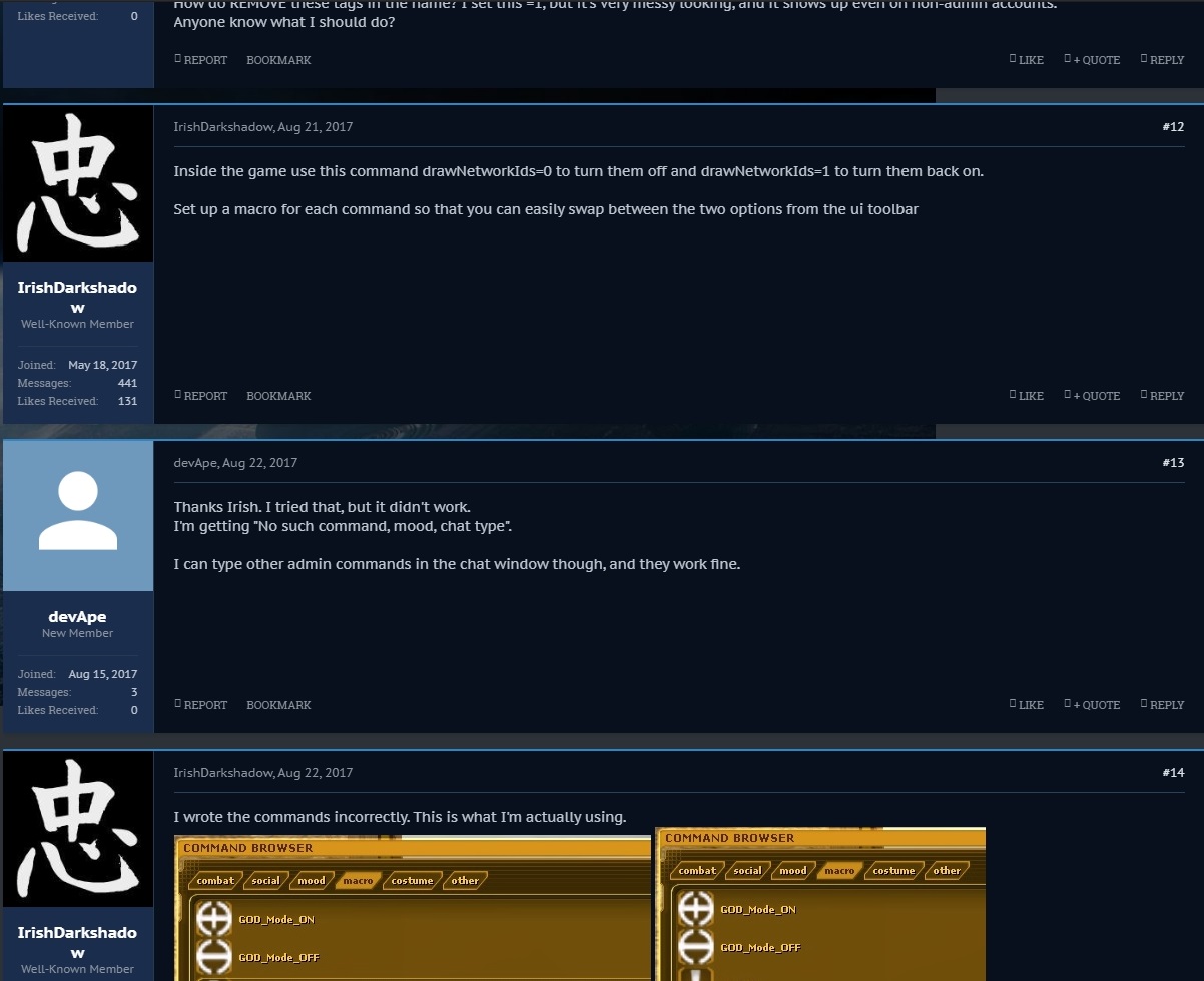 Set up a macro for each command so that you can easily swap between the two options from the ui toolbar REPORT BOOKMARKLIKE + QUOTE REPLY devApe devApe New Member Joined:Aug 15, 2017 Messages:3 Likes Received:0 #13devApe, Aug 22, 2017 Thanks Irish. I tried that, but it didn't work. I'm getting "No such command, mood, chat type".