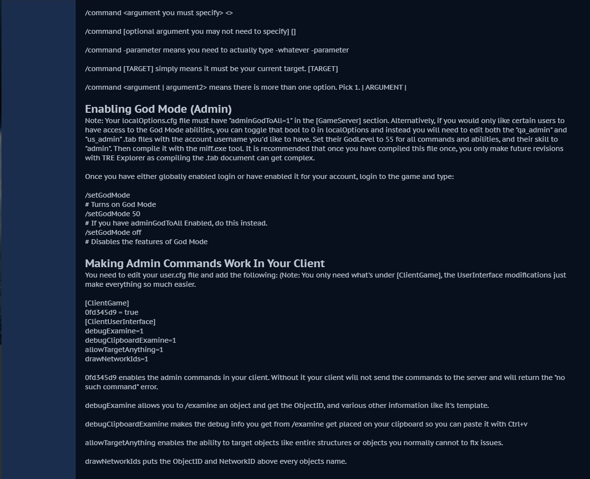 Enabling God Mode (Admin) Note: Your localOptions.cfg file must have "adminGodToAll=1" in the [GameServer] section. Alternatively, if you would only like certain users to have access to the God Mode abilities, you can toggle that bool to 0 in localOptions and instead you will need to edit both the "qa_admin" and "us_admin" .tab files with the account username you'd like to have. Set their GodLevel to 55 for all commands and abilities, and their skill to "admin". Then compile it with the miff.exe tool. It is recommended that once you have compiled this file once, you only make future revisions with TRE Explorer as compiling the .tab document can get complex.