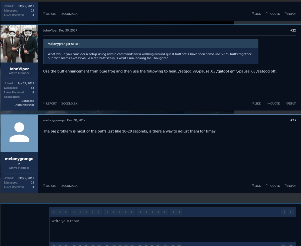 [ClientGame] 0fd345d9 = true REPORT BOOKMARKLIKE + QUOTE REPLY MKDAWUSS MKDAWUSS Member Joined:Dec 9, 2017 Messages:5 Likes Received:0 #20MKDAWUSS, Dec 16, 2017 Double-checked and that line is checked as true, and I have run it in God Mode (I don't think the error notice even comes up outside of it). I can call things up using the QA Tool menu, and acquire things using the /createstaticitem + item name from the spreadsheet up top, but that's about it. Templates? Nothing... REPORT BOOKMARKLIKE + QUOTE REPLY melonygranger melonygranger Active Member Joined:May 9, 2017 Messages:25 Likes Received:4 #21melonygranger, Dec 28, 2017 What would you consider a setup using admin commands for a walking around quest buff set. I have seen some use 30-40 buffs together but that seems excessive. So a ten buff setup is what I am looking for. Thoughts? REPORT BOOKMARKLIKE + QUOTE REPLY JohnViper JohnViper Active Member Joined:Apr 22, 2017 Messages:33 Likes Received:4 Occupation:Database Administrator #22JohnViper, Dec 30, 2017 melonygranger said: ↑ What would you consider a setup using admin commands for a walking around quest buff set. I have seen some use 30-40 buffs together but that seems excessive. So a ten buff setup is what I am looking for. Thoughts? Use the buff enhancement from blue frog and then use the following to heal: /setgod 99;/pause .05;/qatool gmr;/pause .05;/setgod off; REPORT BOOKMARKLIKE + QUOTE REPLY melonygranger melonygranger Active Member Joined:May 9, 2017 Messages:25 Likes Received:4 #23melonygranger, Dec 30, 2017 The big problem is most of the buffs last like 10-20 seconds, is there a way to adjust them for time? REPORT BOOKMARKLIKE + QUOTE REPLY Write your reply...