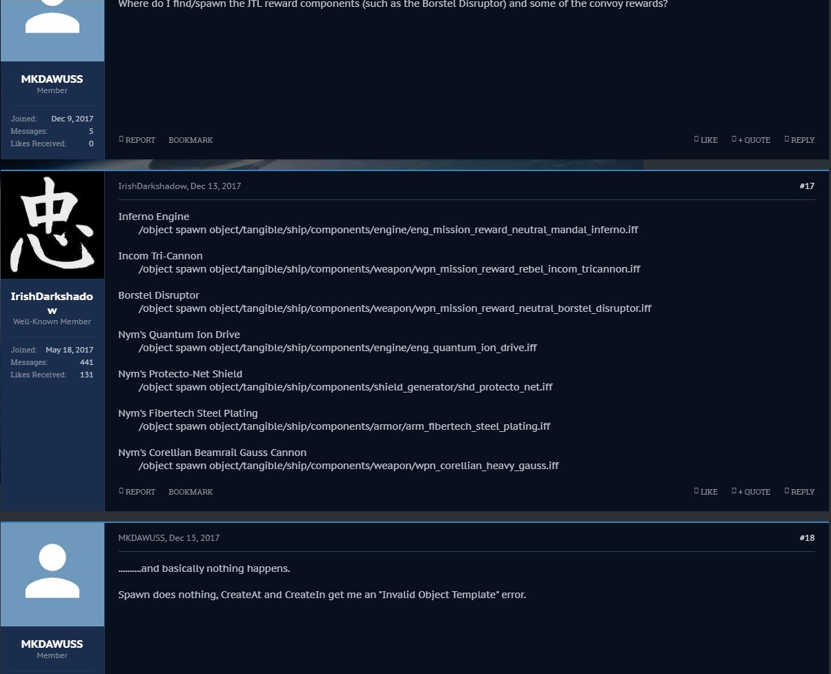 thank you so much:) REPORT BOOKMARKLIKE + QUOTE REPLY MKDAWUSS MKDAWUSS Member Joined:Dec 9, 2017 Messages:5 Likes Received:0 #16MKDAWUSS, Dec 12, 2017 Where do I find/spawn the JTL reward components (such as the Borstel Disruptor) and some of the convoy rewards? REPORT BOOKMARKLIKE + QUOTE REPLY IrishDarkshadow IrishDarkshadow Well-Known Member Joined:May 18, 2017 Messages:441 Likes Received:131 #17IrishDarkshadow, Dec 13, 2017 Inferno Engine /object spawn object/tangible/ship/components/engine/eng_mission_reward_neutral_mandal_inferno.iff
